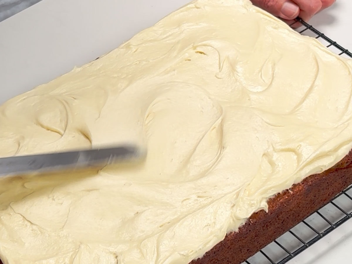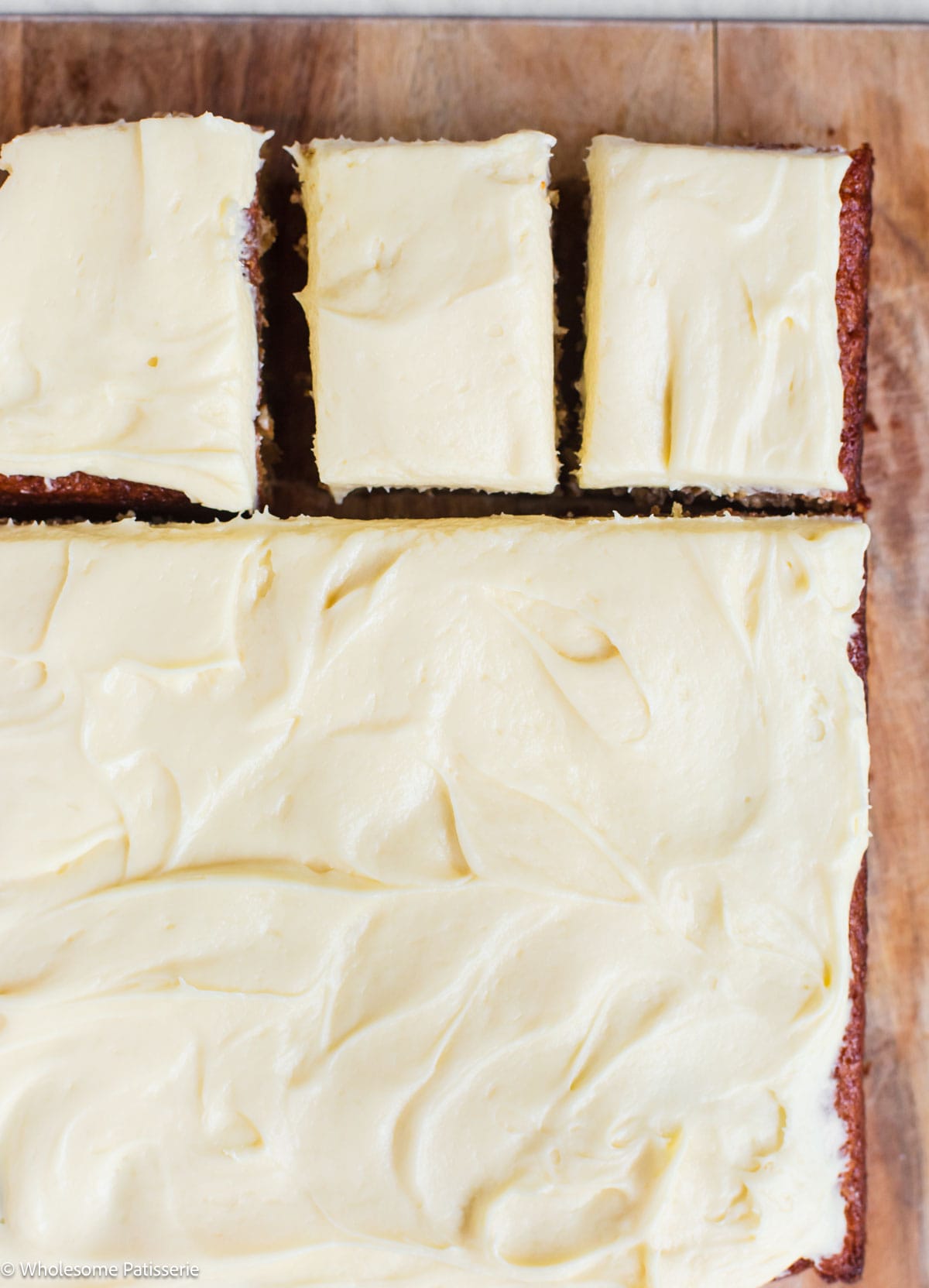 Step 6: Spread the frosting evenly over the cooled cake. Slice into squares, serve and enjoy!