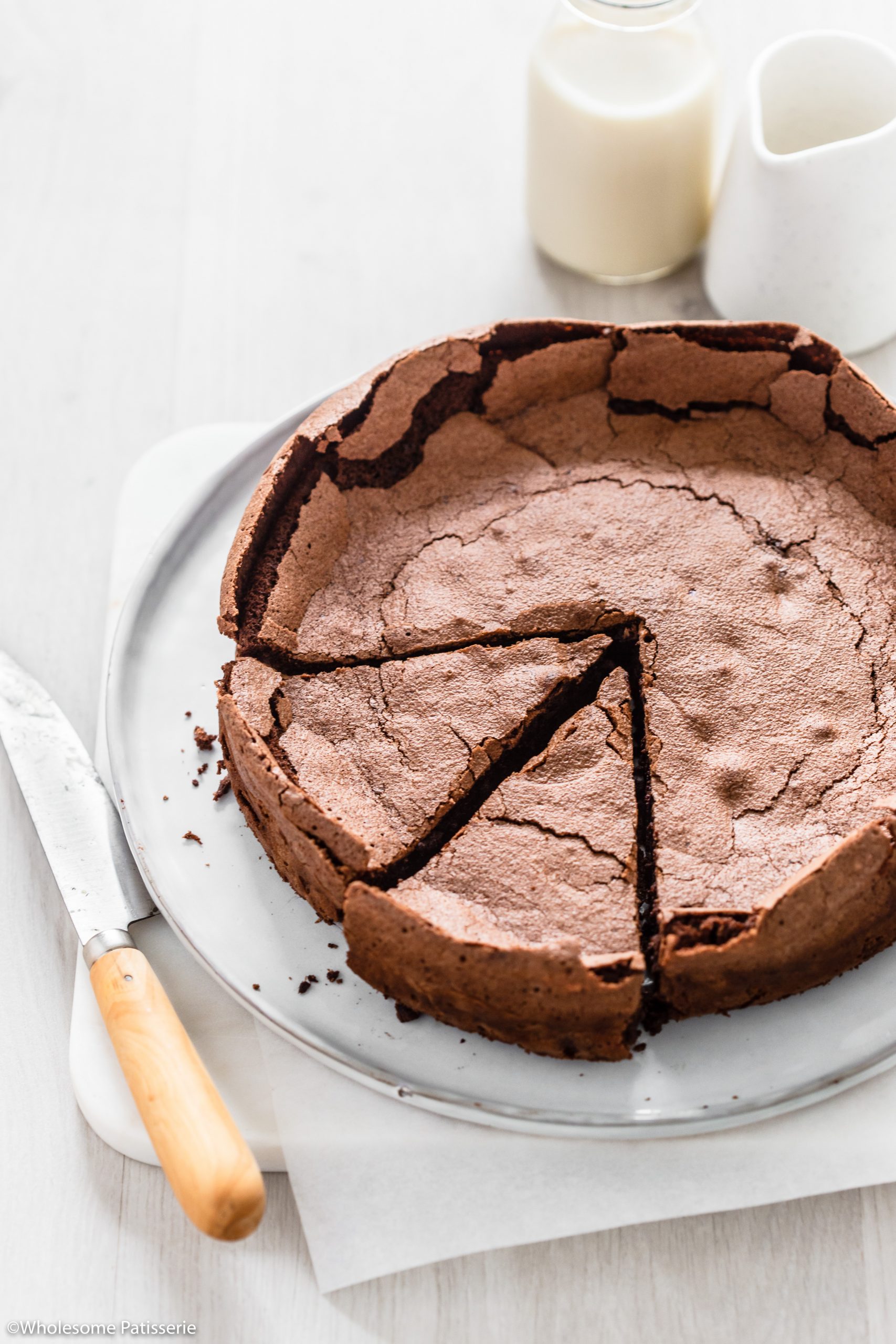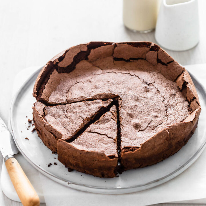 Unlike a classic cake, this one has a soft, fudgy centre with a delicate, crackly top. The structure comes from whipped eggs rather than flour or dairy, giving it that signature melt-in-your-mouth texture.