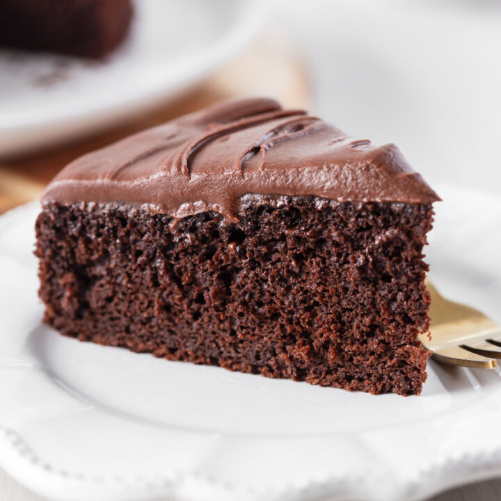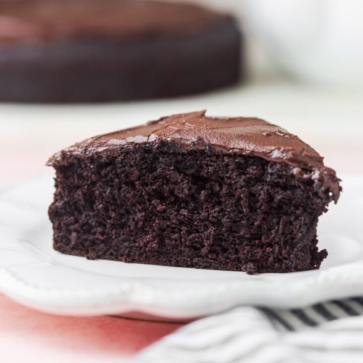 This chocolate cake without milk is rich, moist, and easy to make. One bowl, simple ingredients. Perfect for an easy single-layer chocolate cake!