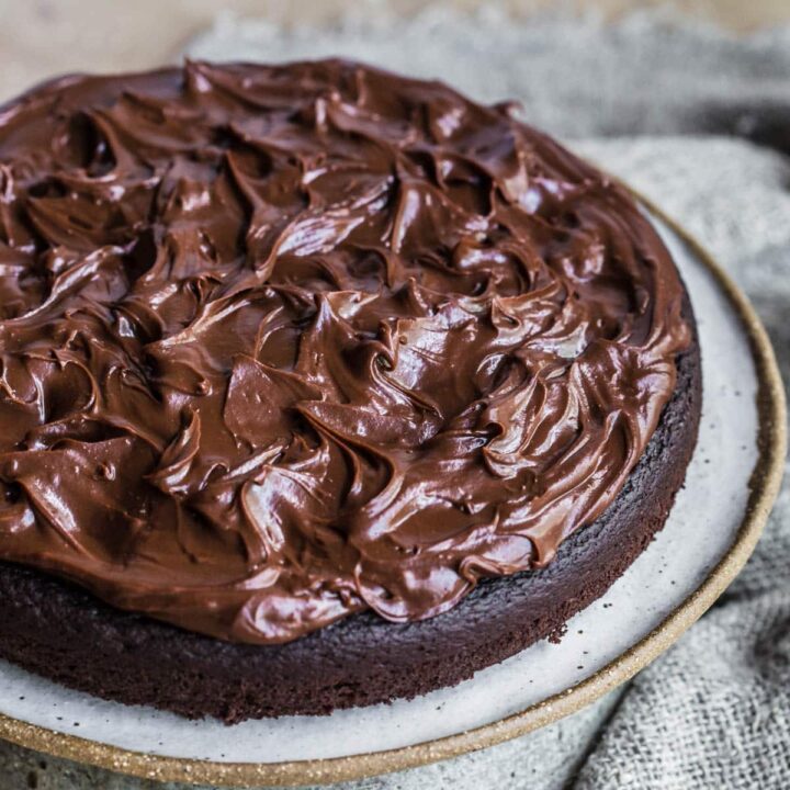 This is a rich, fudgy gluten and milk free chocolate cake with a soft crumb and silky ganache topping.