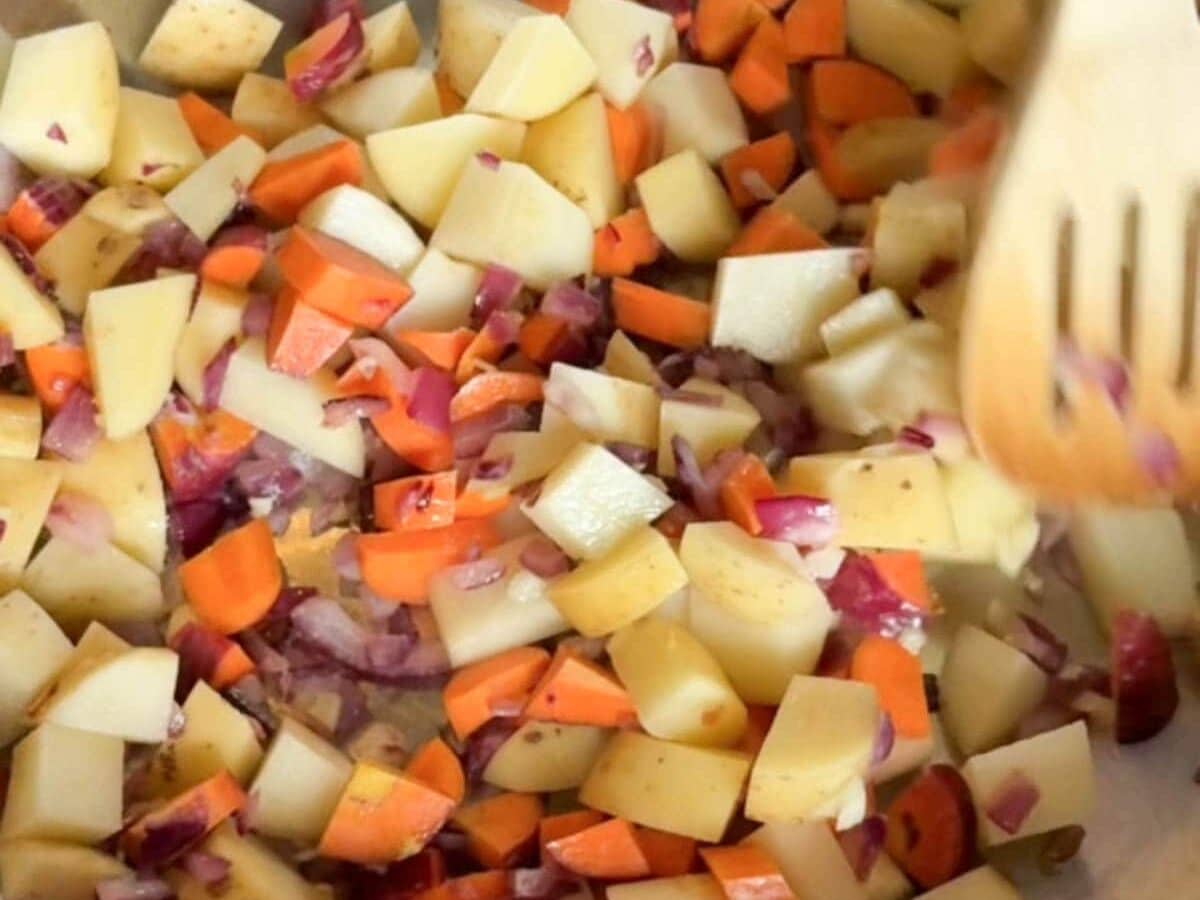 - Cook Vegetables: Add the cubed carrots and potatoes and the remaining 1 tablespoon olive oil. Cook for 5 minutes over medium-high heat, stirring occasionally, until slightly softened.