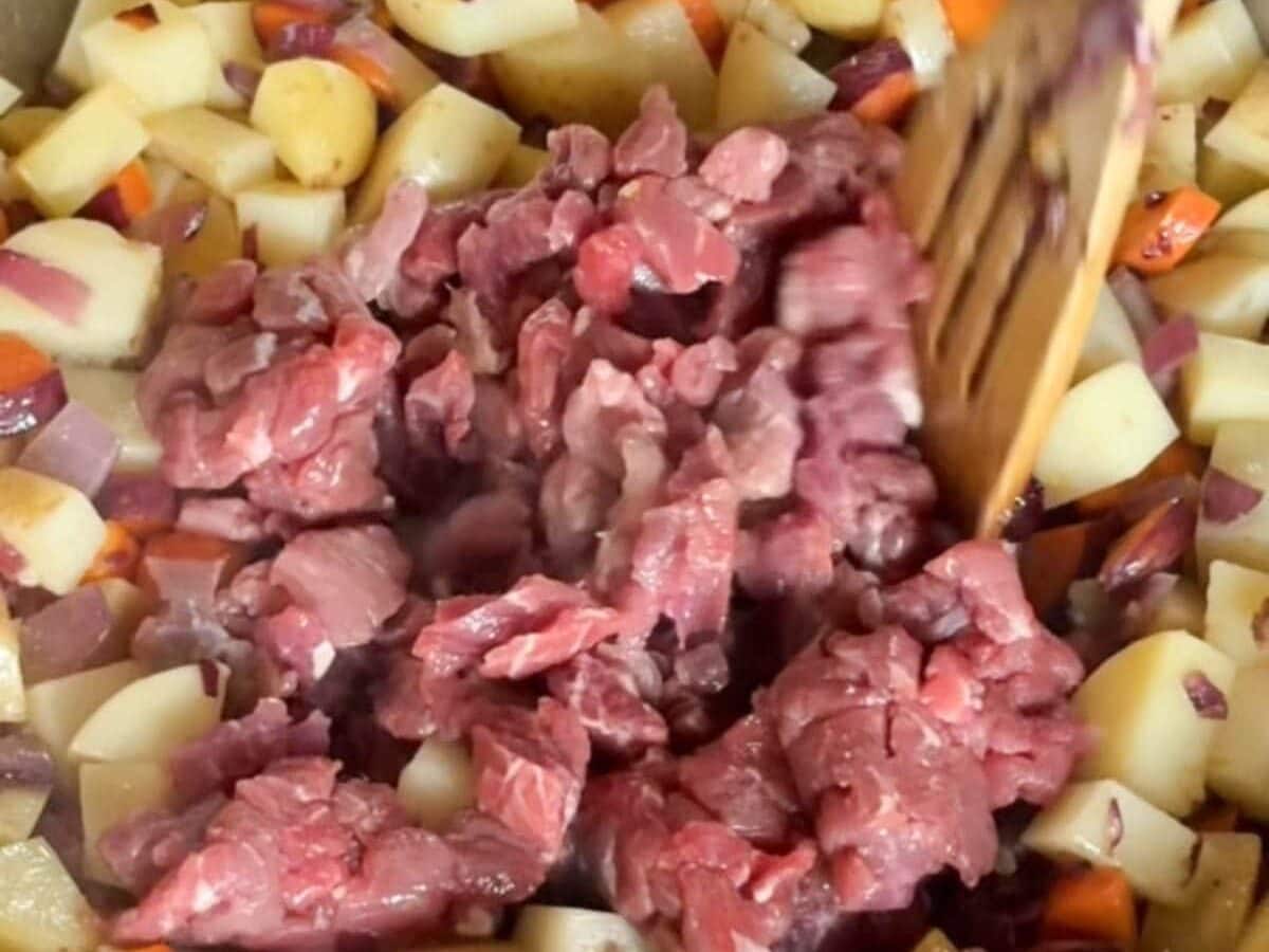 Step 3: Push the vegetables to the sides of the pot and add the beef to the center. Cook over medium-high heat for 3–4 minutes until lightly browned, then stir the vegetables back through and cook for another 1–2 minutes until the beef is browned all over.