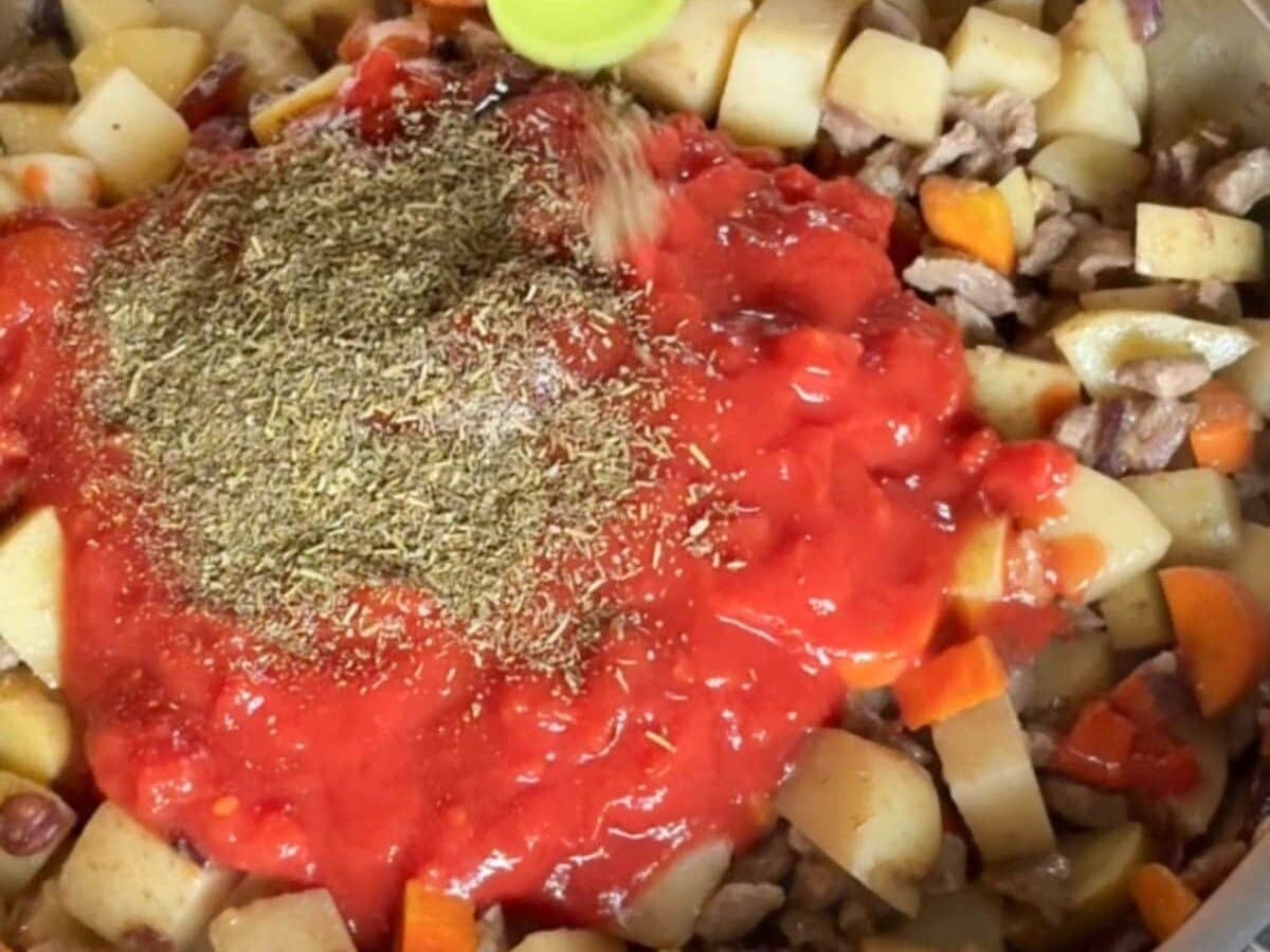 Step 4: Add the canned diced tomatoes with their juice, tomato paste, soy sauce, Italian seasoning, salt, and pepper. Stir until well combined.