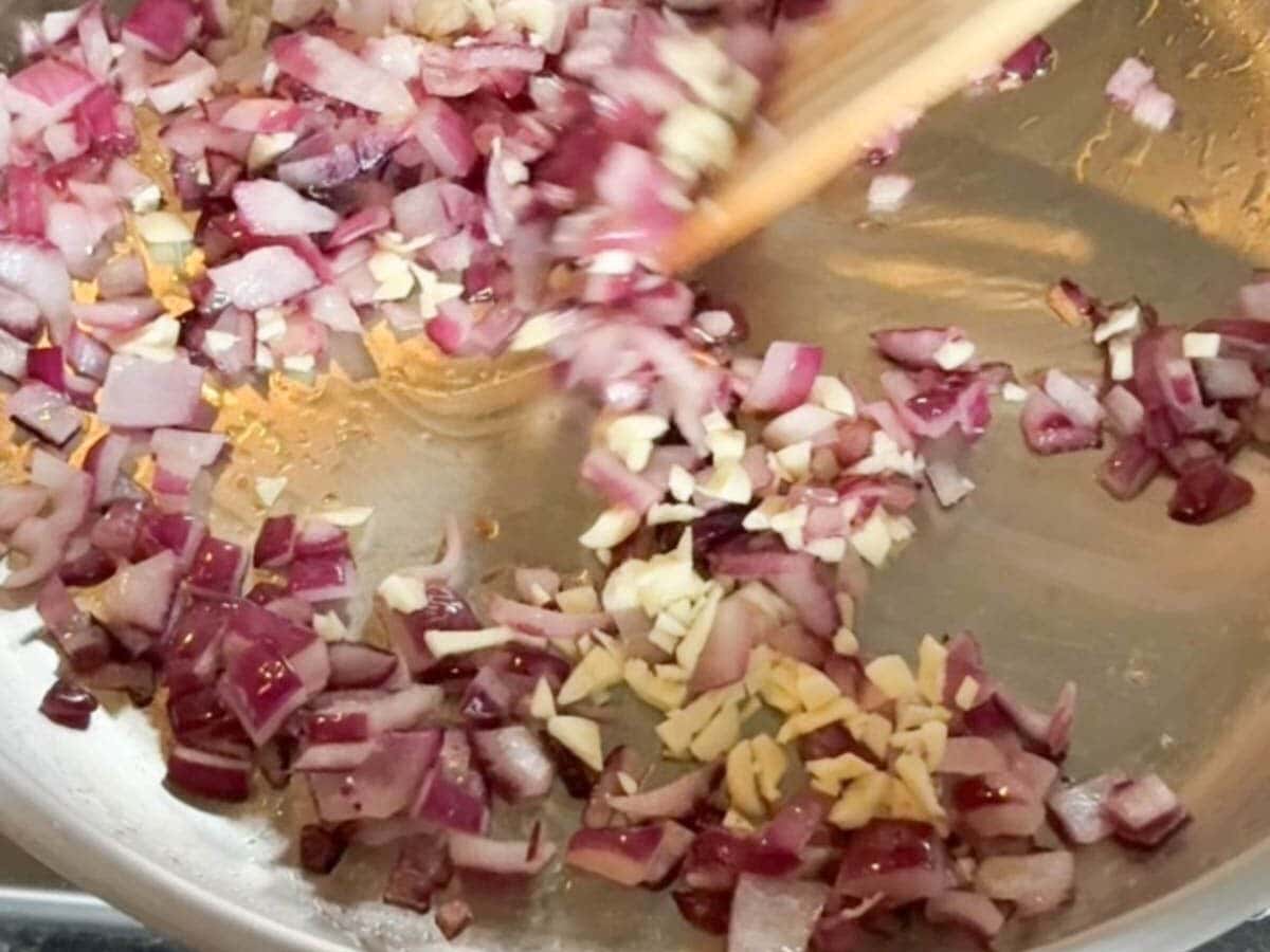 - Sauté Onion and Garlic: In a large skillet or Dutch oven, add 1 tablespoon olive oil and heat over medium-high. Add the chopped onion and cook for about 3 minutes until softened and starting to brown. Stir in the minced garlic and cook for another 30 seconds until fragrant.