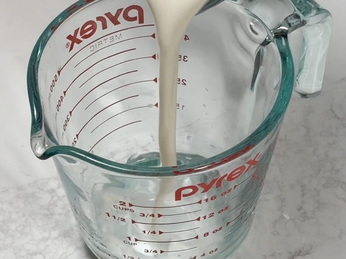 Step 1: Pour the white vinegar into a 1-cup (240 ml) measuring cup. Pour in the milk and stir with a spoon until well combined. Let the mixture sit for 5 minutes while you continue with the batter, no longer.
