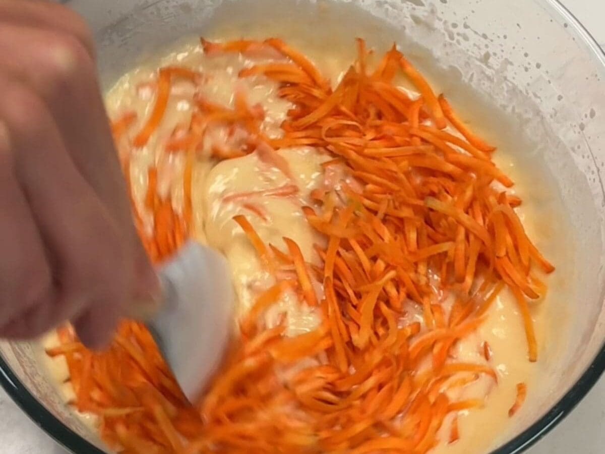 Step 2: Gently fold the shredded carrots into the batter with a spatula.