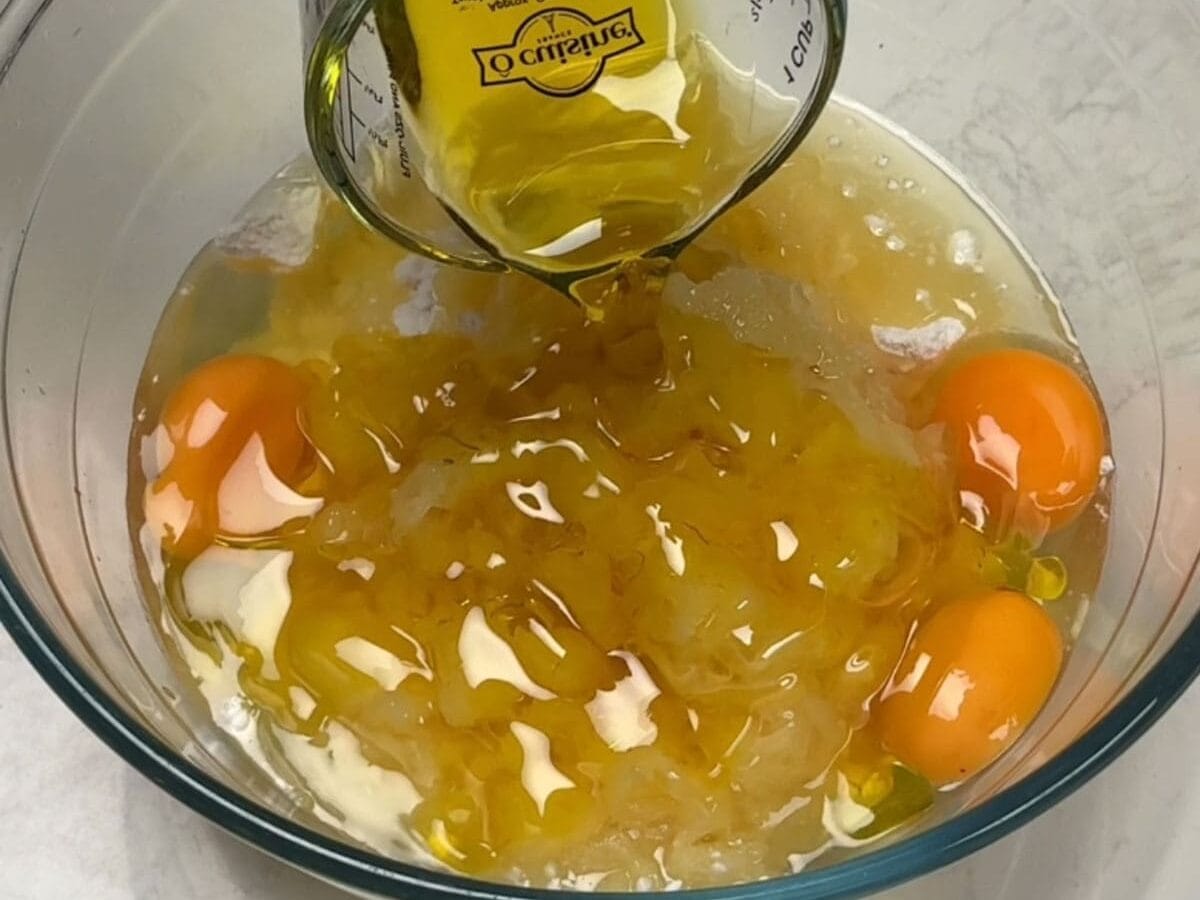 Step 1: In the large mixing bowl, combine cake mix, entire can of crushed pineapple including the juice, eggs, and oil. Beat until well combined.