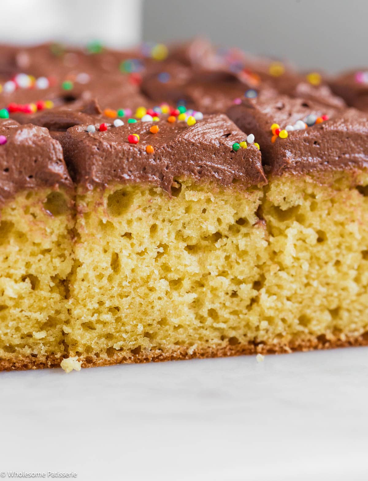 Baked in a 9 x 13-inch sheet pan, this cake slices neatly into generous portions, making it easy to serve, transport, and feed a group. The even bake ensures every piece is just as soft and tender, from corner to centre.