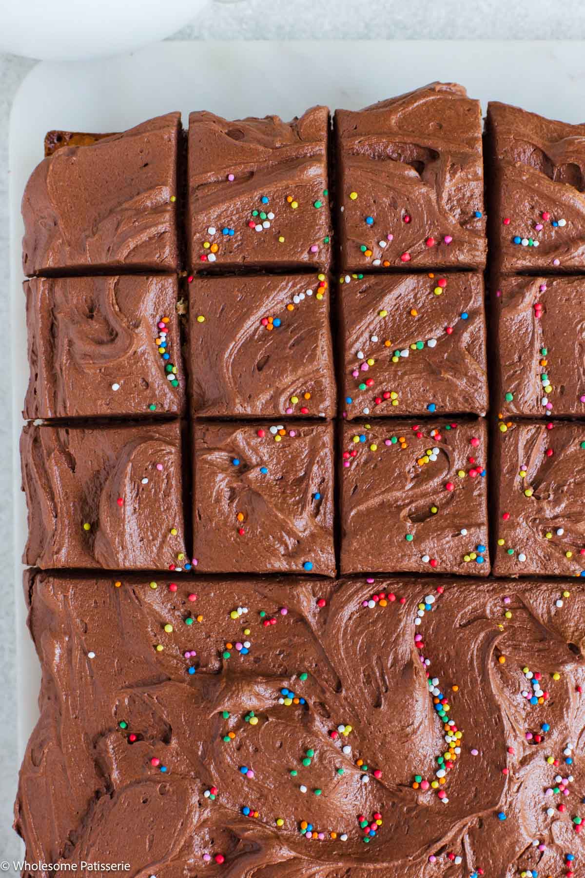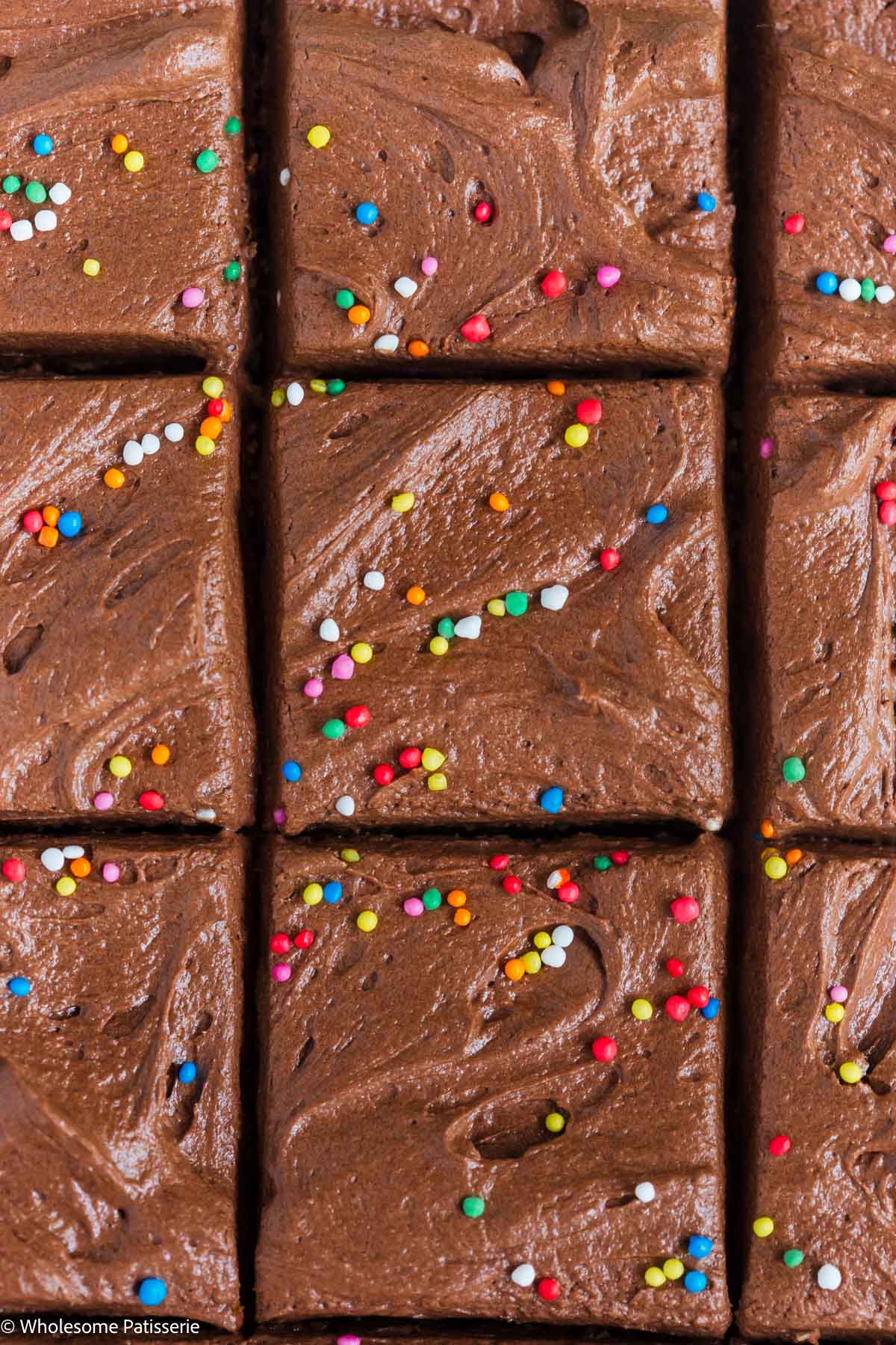 Step 6: Spread the chocolate buttercream over the cooled cake. Add sprinkles if desired. Cut into squares and serve. Enjoy!