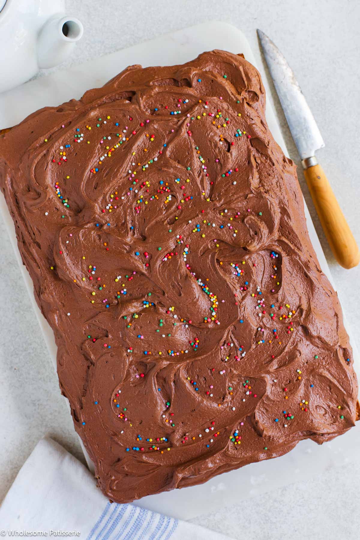 - Frost Cake and Add Sprinkles: Once the cake is completely cooled, spread the chocolate buttercream evenly over the cake. Add sprinkles if desired.